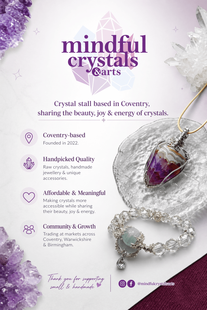 Mindful Crystals & Arts is a crystal stall started in 2022. As a crystal collector, graphic designer and Reiki practitioner, I’m passionate about sharing my love for crystals and offering carefully handpicked, high-quality pieces.